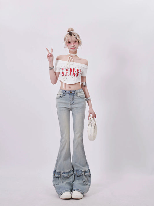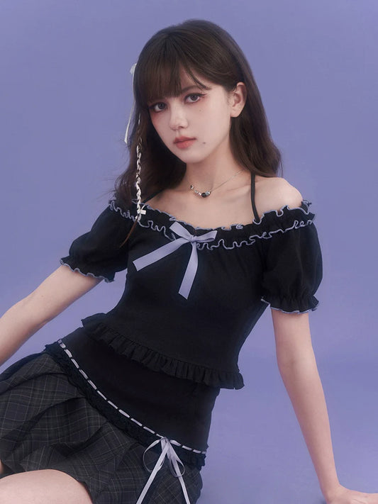 Summer Design Straps Pants Rabbit Off-Shoulder Black White Hoodie Tops Suit
