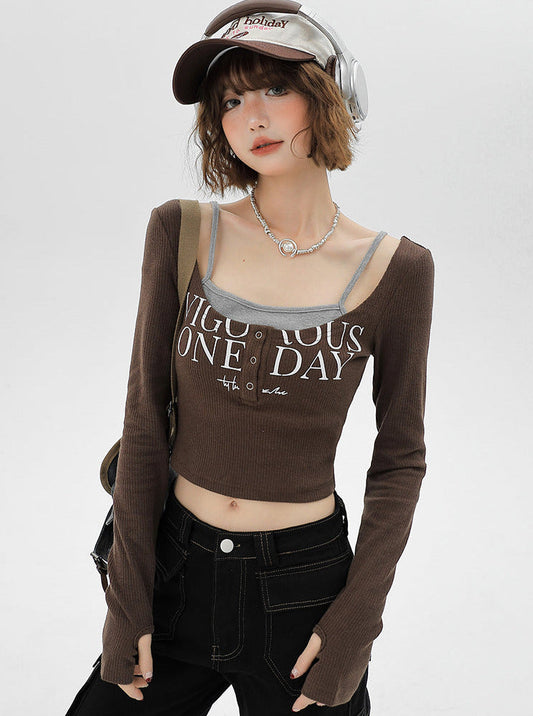 Sleeve Split Short Print Slim Top Letter