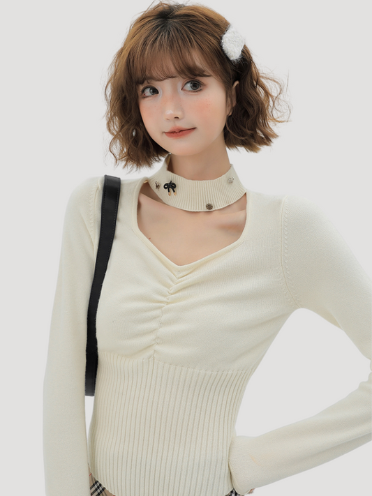 Top Halter Neck Slim Knit Piece Faux Ribbon Two