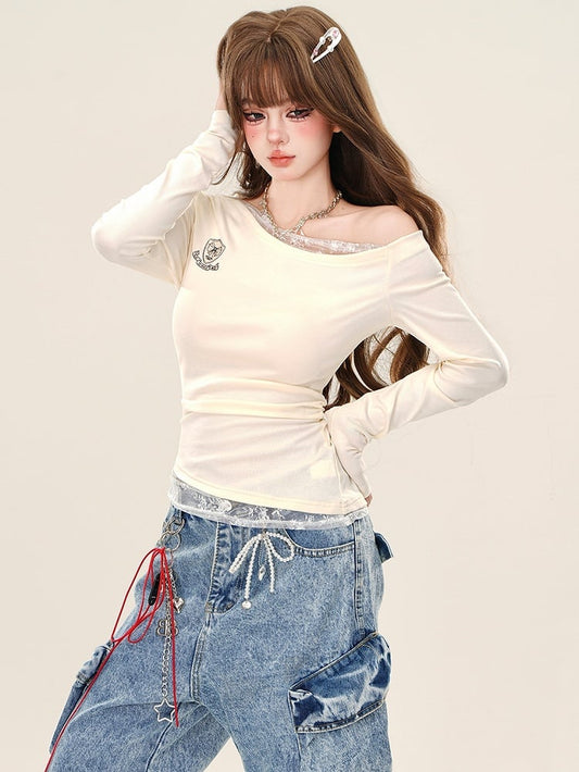 White Rhinestone Letters Lace Patchwork Long Sleeves Top