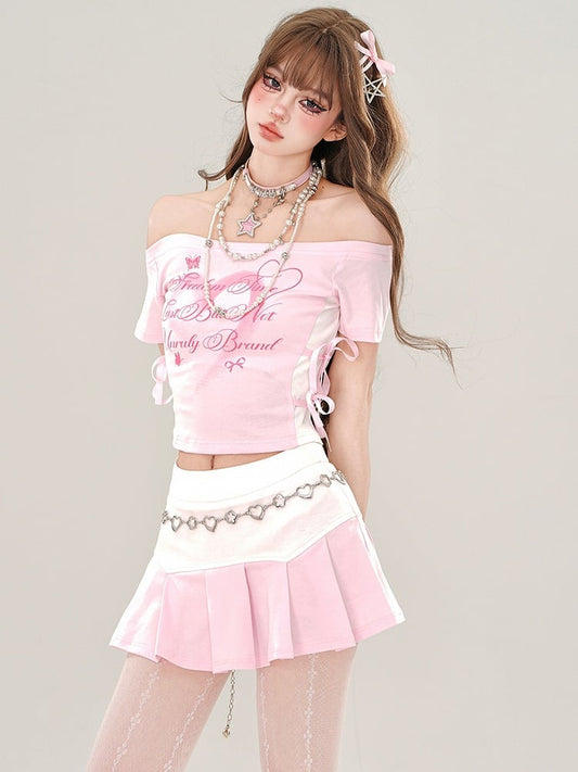 Pink Letters Print Off-Shoulder Crop Top with Self-tie Bows at Waist