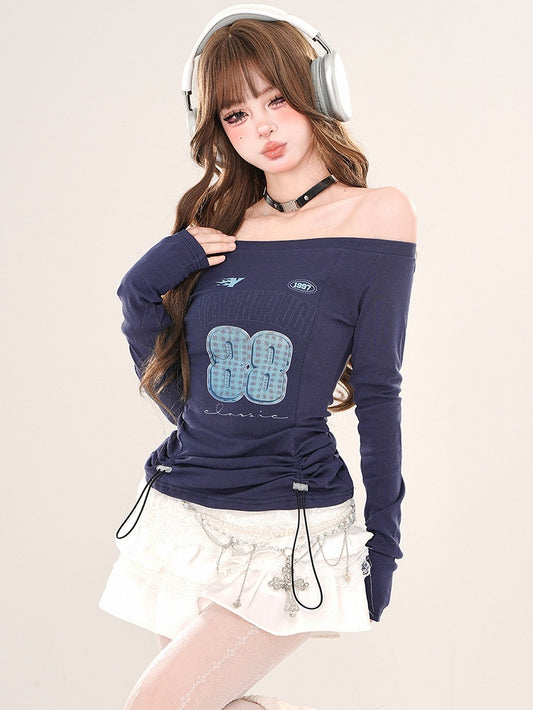 Royal Blue Number Print Off-Shoulder Top with Adjustable Drawstring Waist