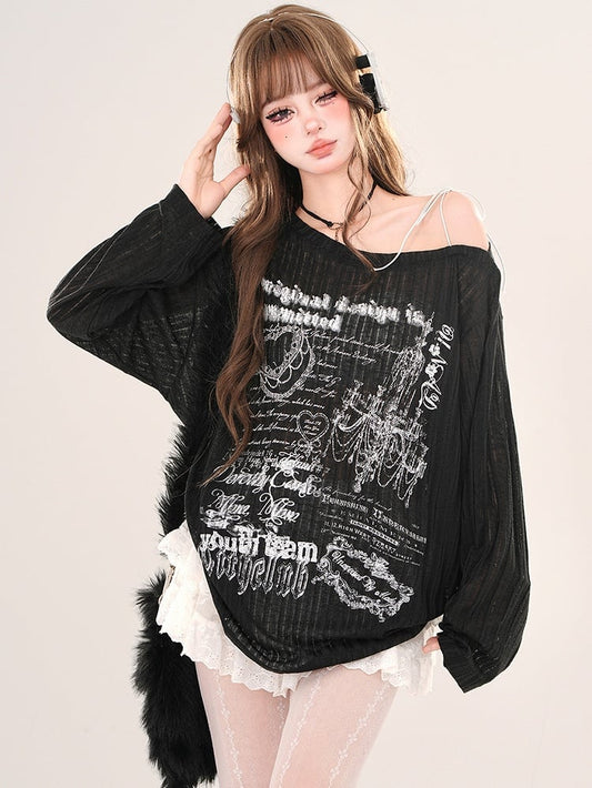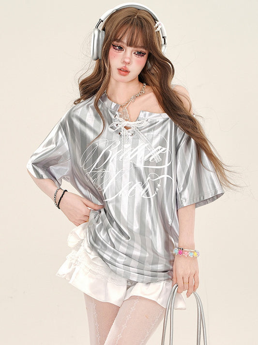 Grey Letter Cutout Shoulder Top with Lace-up Neckline