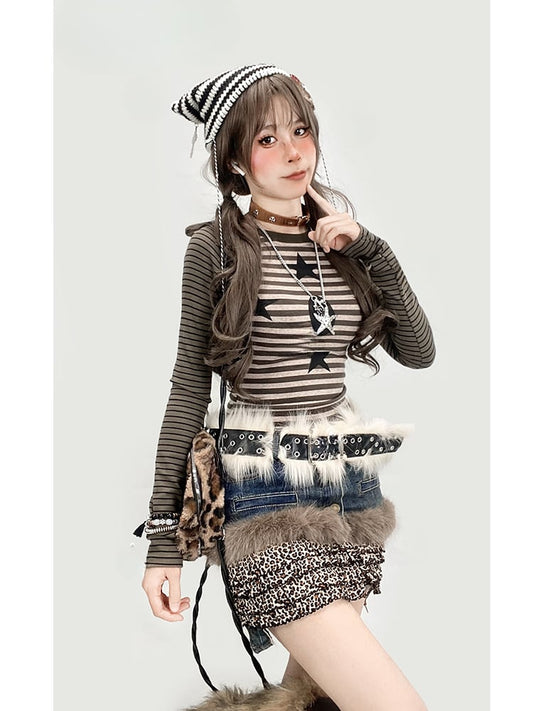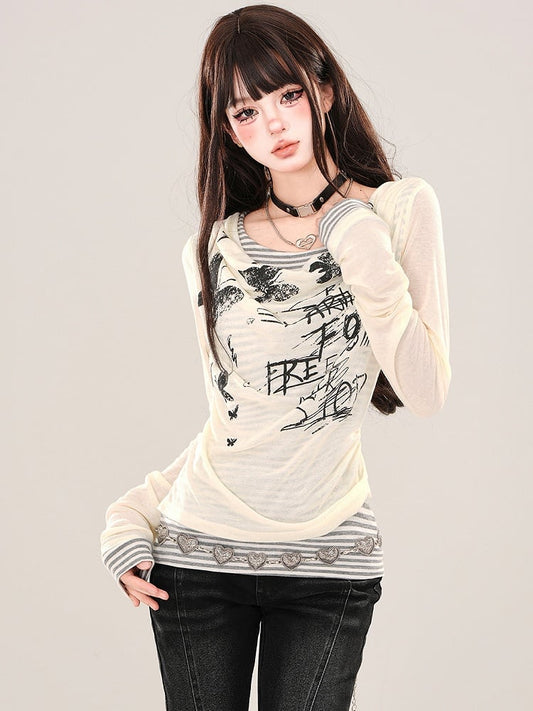 Apricot/Black Graphic Mesh Fake Two-piece Striped Long Sleeves Top