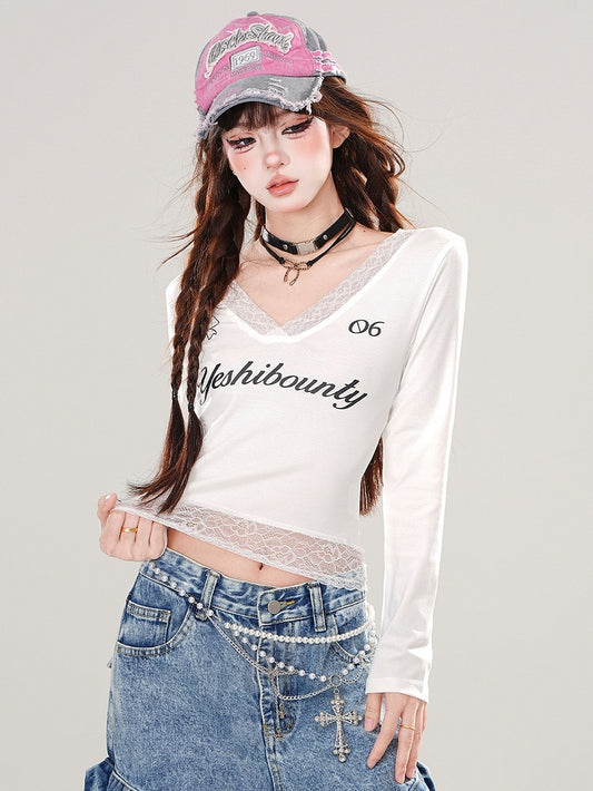 White Lace Patchwork V-neck Long Sleeves Top