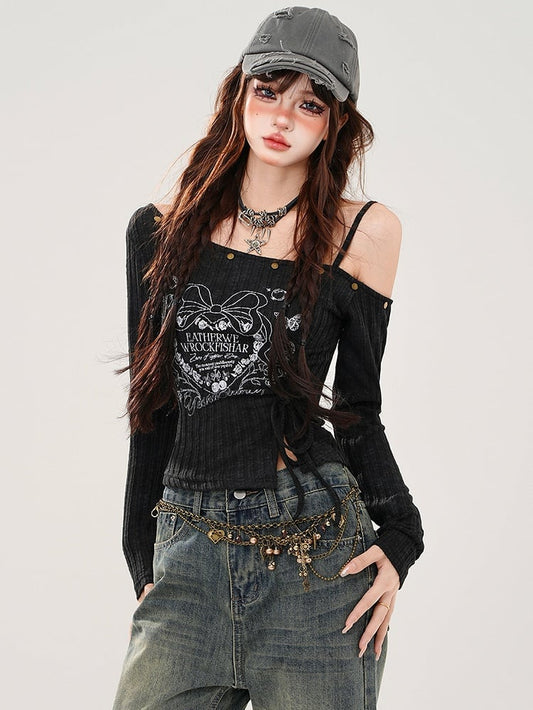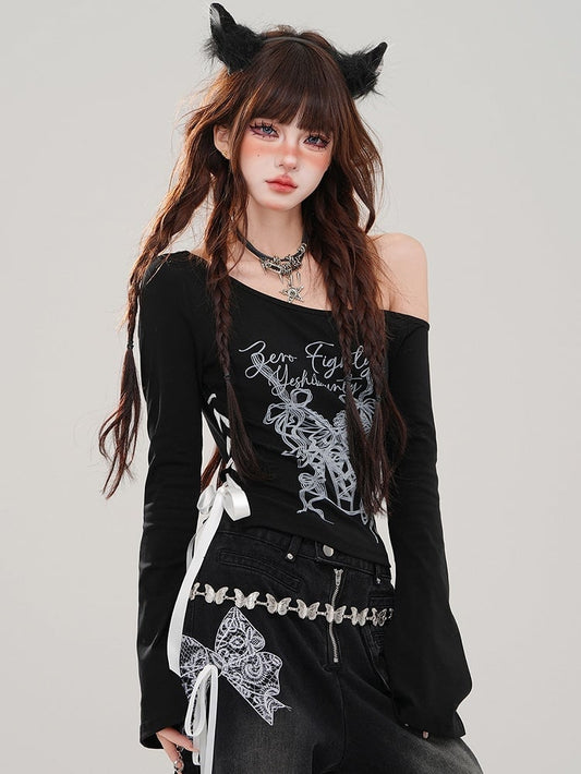 Black Letters and Butterflies Asymmetrical Neckline Long Sleeves Top