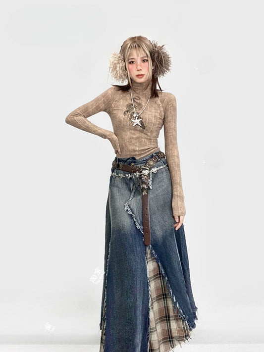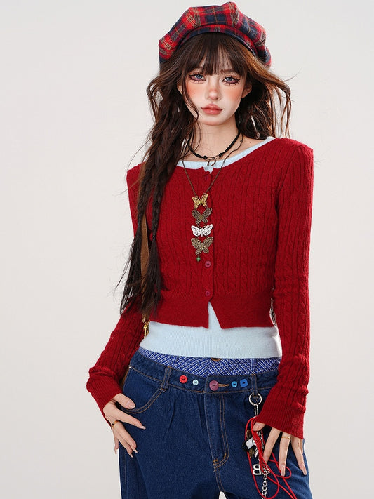Red/Black/Grey Fake Two-piece Design Slim-fit Knit Top