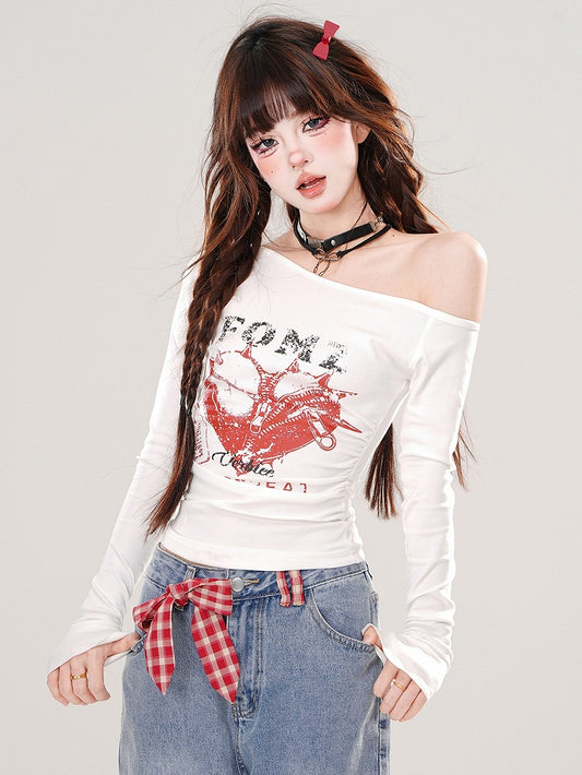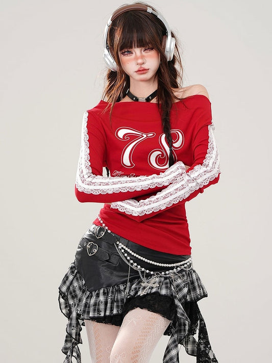 Red Letters Off-the-shoulder Necklin Top Lace Applique Sleeves