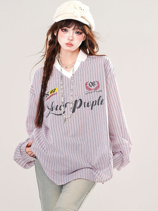 Blue/Pink Letters V-neck Striped Loose Top