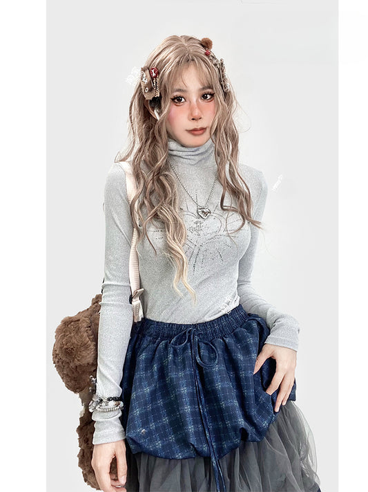 Light Grey High Neck Heart-shaped Rhinestones Knitted Top