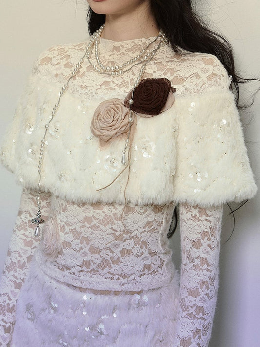 Apricot Flowers Adorned Plush Shawl Long Sleeves Lace Top