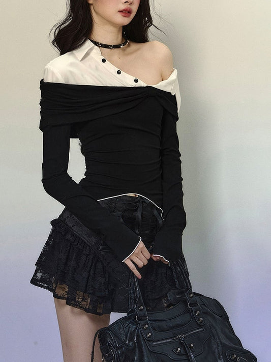 Black and White Fake Two-piece Asymmetrical Neckline Top