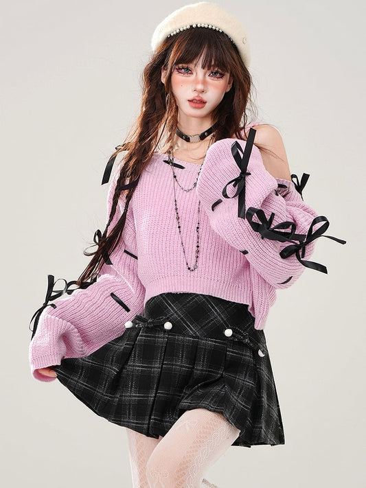 Blue/Pink Bows Adorned Sleeves Cropped Sweater with Cami Top Set