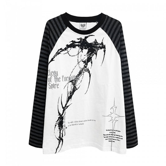 Black/White Graphic Raglan Lettering Prints with Top and Long Sleeves Striped Gothic
