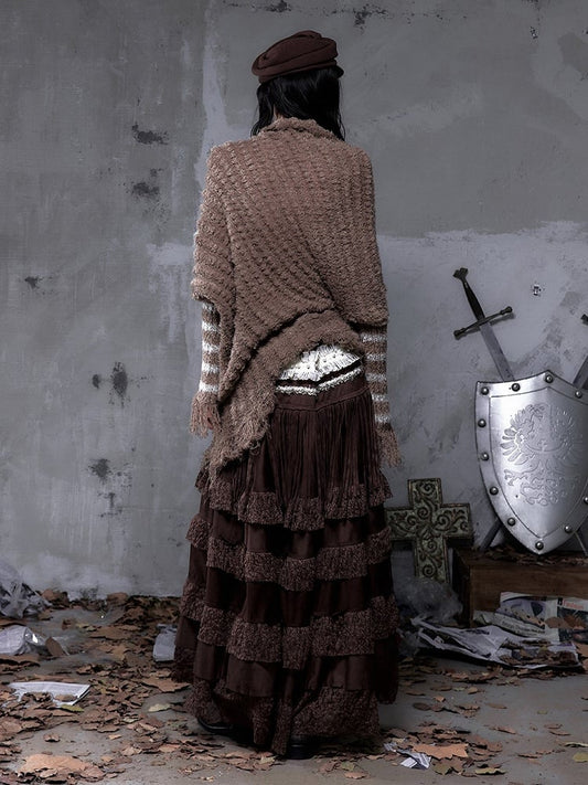Top Shoulder Sweet Set Skirt Brown Cutout Plaid Lolita + Knit