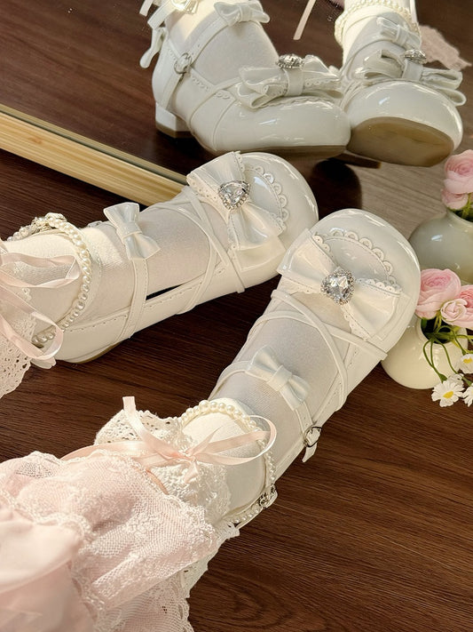 Bow Crisscross Heels White in Sweet Mid Cat with Straps Accents Lolita Heel