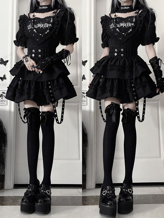 with Patch Dress Puff Skirt Tiered Sleeve Heart Black Short Gothic Ruffle