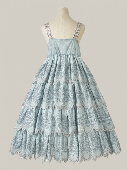 Jumper with Trim Scallop Skirt Blue Classic Layered Print Embroidered Lolita Floral