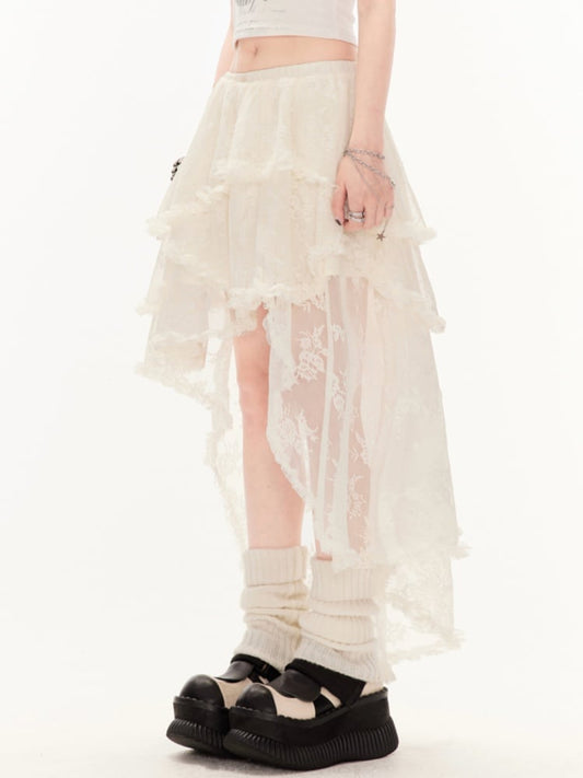 Skirt Apricot Low Hem Waist High-low Tiered Lace Asymmetrical with