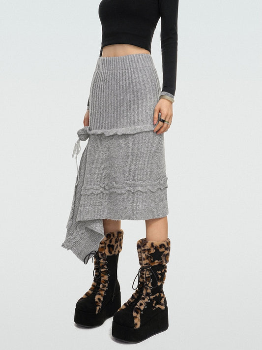 Asymmetrical Grey A-Line Knit Skirt with Rose Ribbon Detail