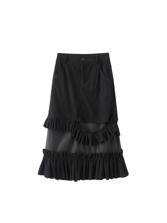 Corduroy Black Ruffle Elegant Hem with Deconstructed A-Line Skirt