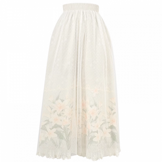 Skirt Beige Elastic Waist Lily Print Cottagecore with Country Overlay Mesh