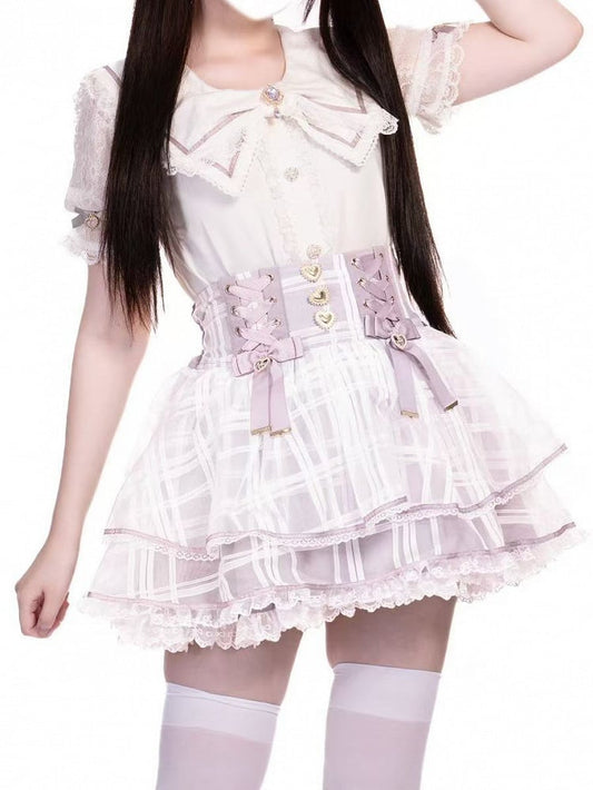 High Purple Plaid with Layer Lace-up Waist Jirai Triple Organza Skirt Detail Kei