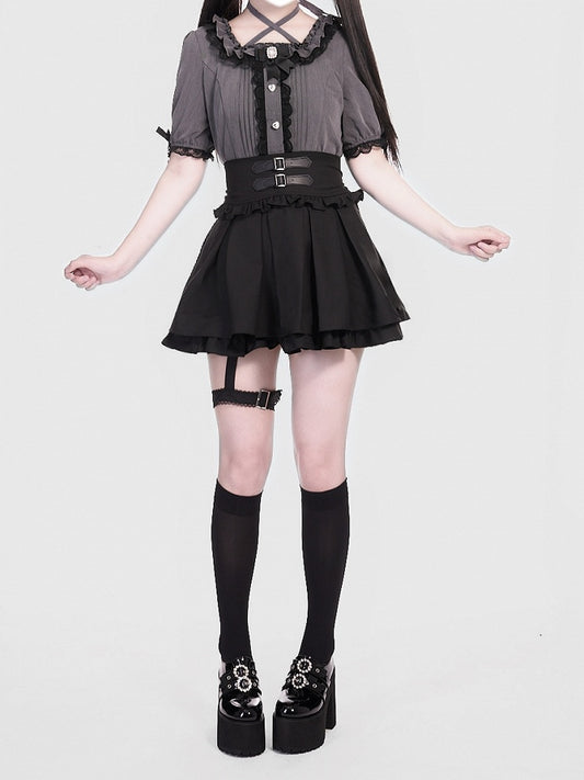 Gray Jirai Kei Double and Layers Skirt in Black with Double Buckle Straps Garter
