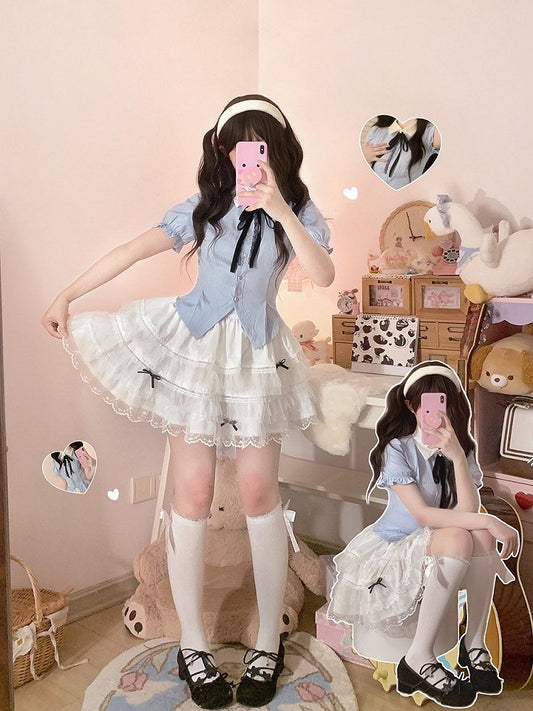 Bows Tiered Skirt High Waist Jirai Light with Kei Blue