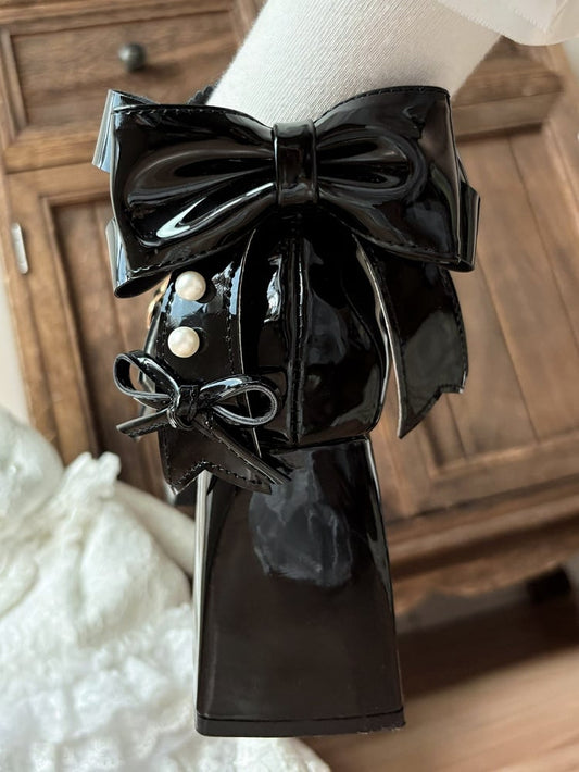 Straps Janes Crisscross Style Heel Block Lolita Black with Mary Bow High - Bead-Embellished Accents Sweet