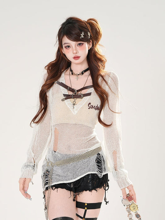 Mesh White/Gray Holes V-neck Buckle Straps Distressed