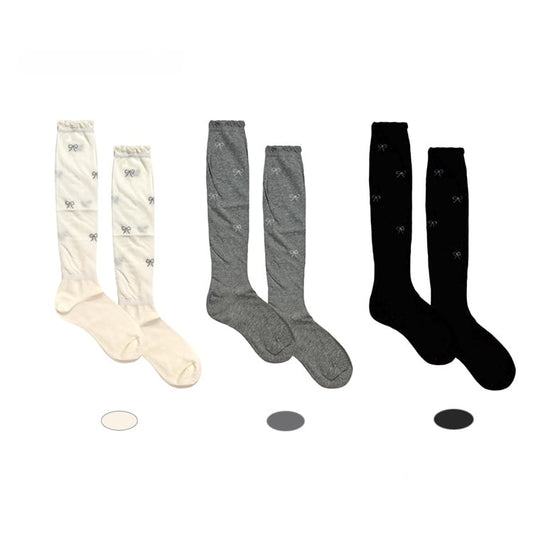 Bow Calf Socks Rhinestone Ribbed Embellished