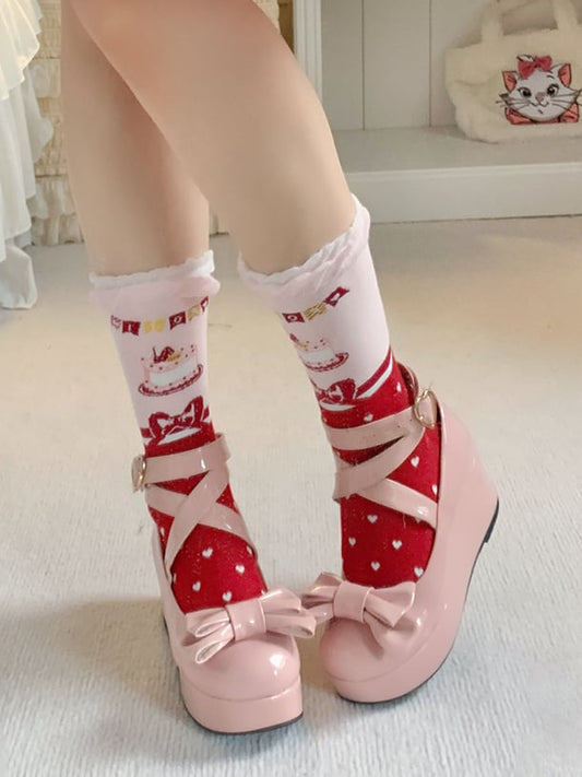 Sweet Lolita Cake Strawberry Bowknot Print Calf Socks