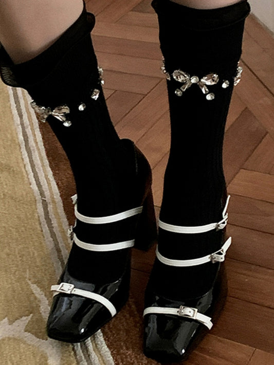 Black Sweet Bowknot Ruffled Cuff Calf Socks