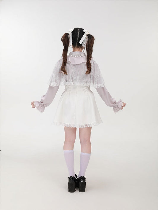 with Trim and Lace Jirai Kei White Cape Design Blouse Flat Collar Pointed