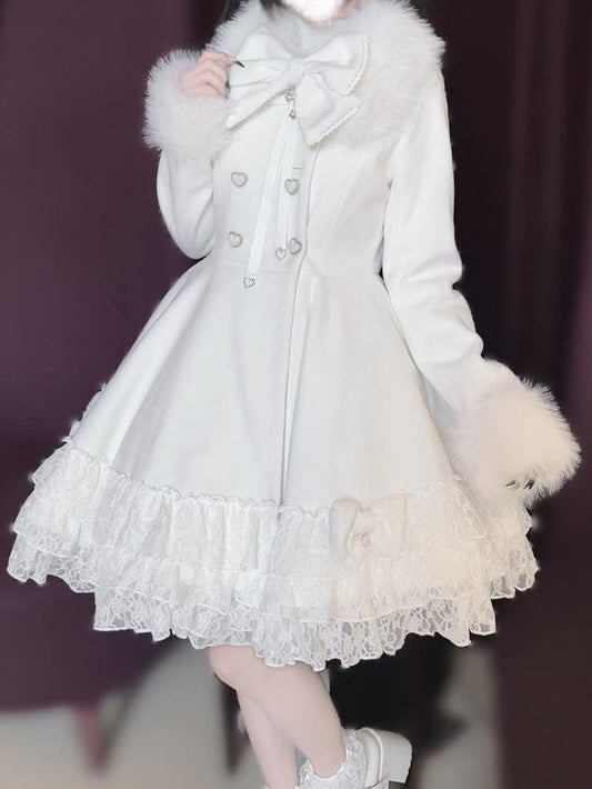 Jirai Kei White Tiered Lace Coat with Detachable Cape and Shaggy Collar