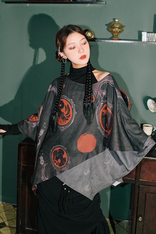 Detachable Retro Cape Black Bronze-tone Buttons Fashion Placket Dress Front Design Elegant