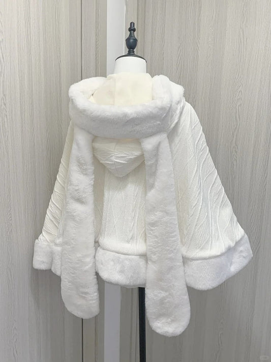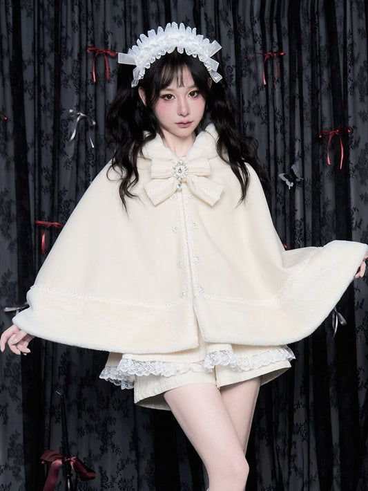 Detachable Jirai Kei Plush Trim Milk Hooded Cape with Big Bow White