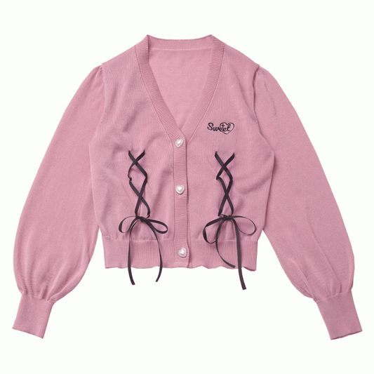 Pink Lace-up Details Front Heart Button Placket Summer Knit Cardigan