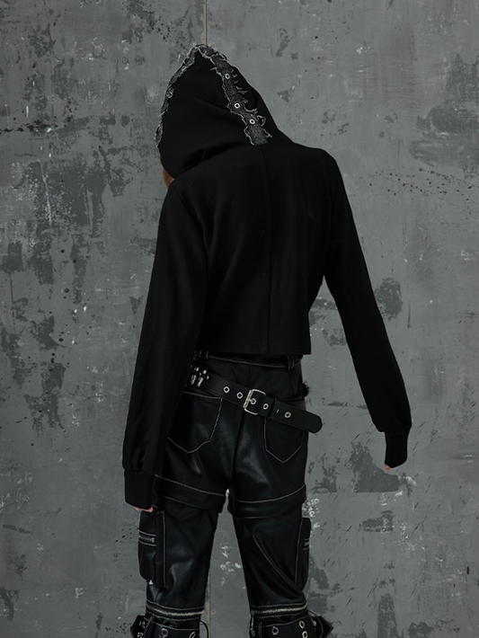 Cardigan With Denim Patchwork Zipper Accents Black Punk Cross Knit Hooded