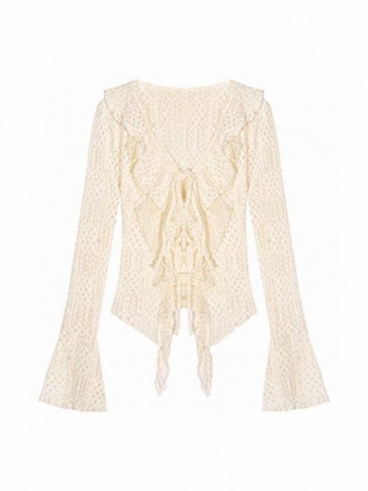 Beige Wasteland Cardigan with Bell Sleeves Punk Lace V-Neck Ruffled