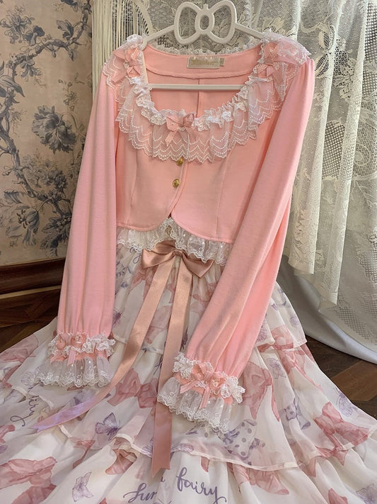 Cropped Pink Cardigan Triple with Edging Lace Bow-Detailed Cute Design