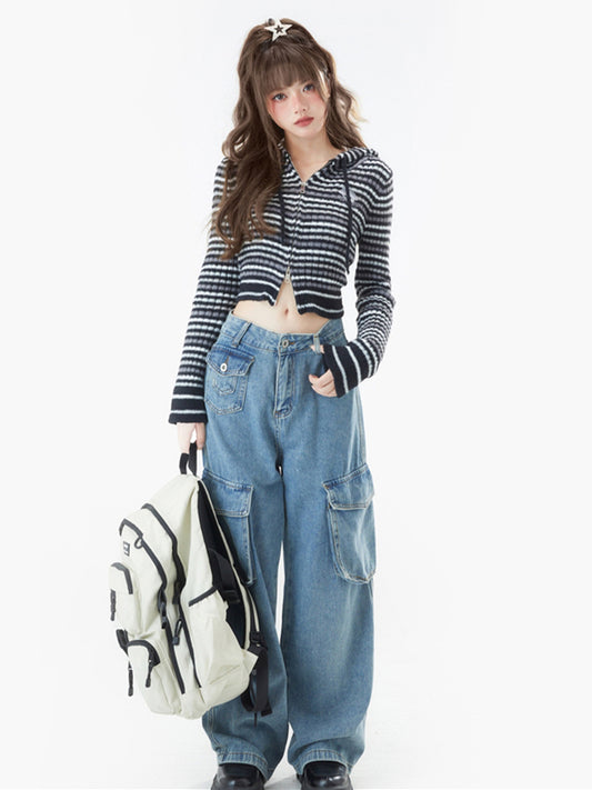 with Cardigan Mohair Closure Vintage Striped Zip High Neck Crop Green