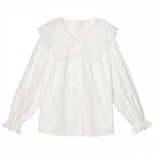 White Oversized Lace Collar Ruffled Cuff Loose Blouse