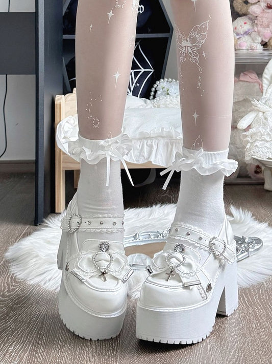 with Heart Bow Cross Mary Embroidery Jirai - Toe Heel Platform Rhinestone Janes Kei White