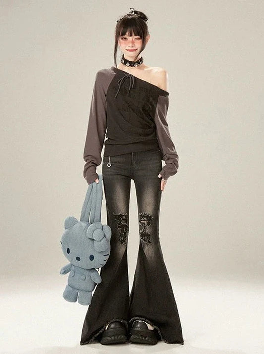 Denim Blue Cute Kitties Faded Wash Wide-leg Cut Jeans