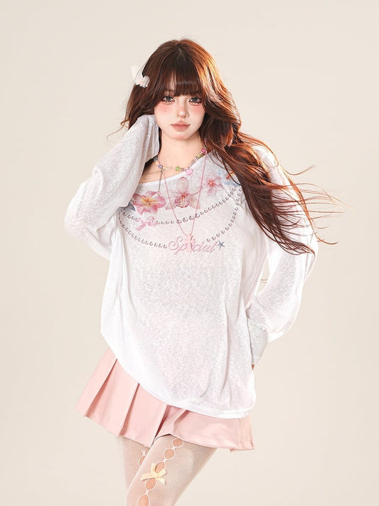 Coverup White Asymmetrical Neckline Floral Print Semi-sheer