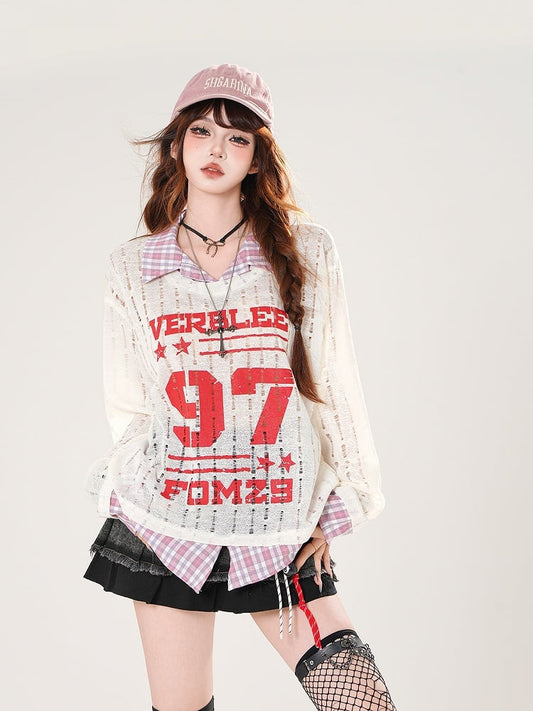 Coverup Faux Holes Distressed Gray/White Plaid Hem Two-pieces