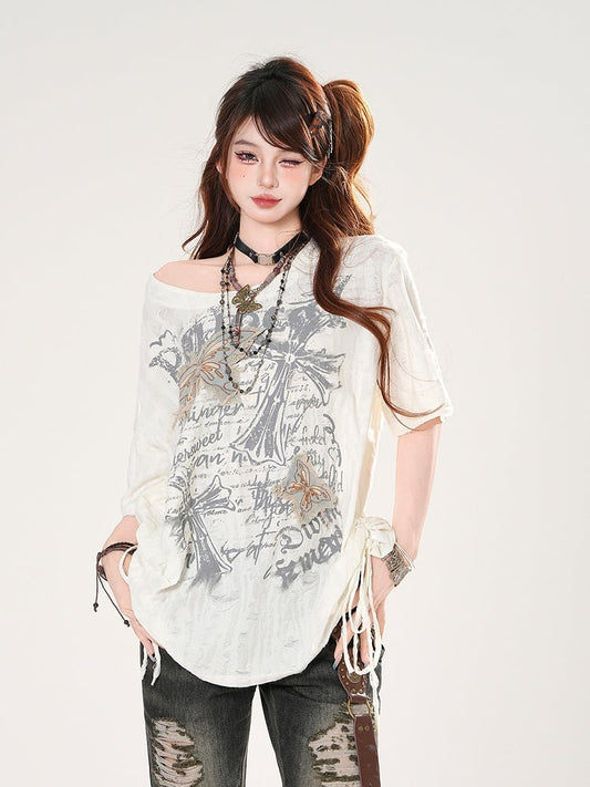 Butterfly Print Black/White Straps Distressed Holes T-shirt Self-tie Neckline