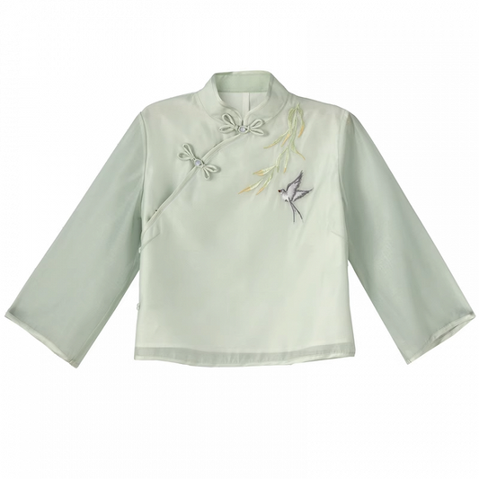 Button Cheongsam Style Top Embroidery Black Pine Tree Knot